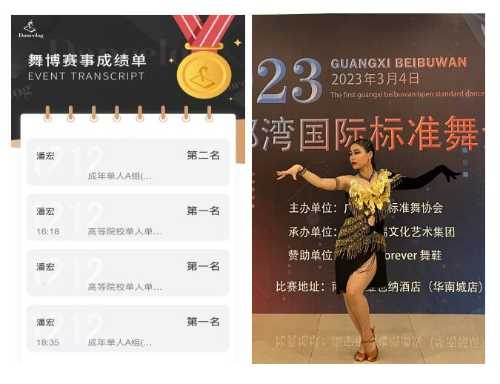 2023年3月4日,中国·广西首届北部湾国际标准舞全国公开赛在广西南宁正式开赛。由人文教育学院舞蹈表演专业(国标舞兼修)学生潘宏、丁小丫、王雨嫣、王雨桐组成的北海艺术设计学院国标舞代表队,在青年教师李晓飞和周琦涵的带领下出战,一举斩获8项冠军、2项亚军、2项季军、1项殿军。