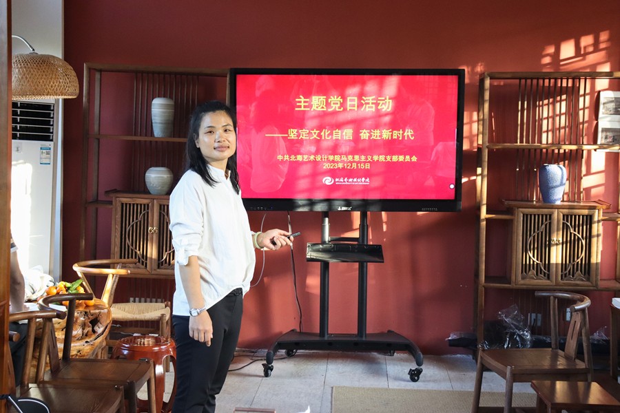 为不断深入学习宣传贯彻习近平新时代中国特色社会主义思想,落实立德树人根本任务,加强党员的党性修养,切实提升支部的创造力、凝聚力、战斗力,12月15日下午,马克思主义学院党支部在汉文化传播产业学院(北海园博园)开展了“坚定文化自信 奋进新时代”主题党日活动,学院全体教师党员、入党积极分子、退休党员等40余人参加。