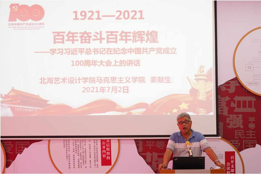 活动上,马克思主义学院院长姜献生教授带领两个支部的党员学习了习近平总书记在庆祝中国共产党成立100周年大会上的重要讲话精神。姜院长从习近平总书记讲话中的关键词为切入点,即从“全面建成小康社会、中国共产党诞生后的三个改变、四个时期的伟大成就、中国共产党人的精神之源与精神谱系、中国共产党的主要代表和革命家、以史为鉴开创未来的九个‘必须’、港澳问题和台湾问题、寄语青年、中国共产党的发展及中华民族的伟大复兴、对中国共产党员的号召”等进行讲解,让全体党员深刻领会习总书记讲话的重要精神。姜院长强调习近平总书记在庆祝中国共产党成立100周年大会上的重要讲话内容丰富、催人奋进,身为一名共产党员,我们要向先辈学习,从中国共产党的百年奋斗中汲取力量。