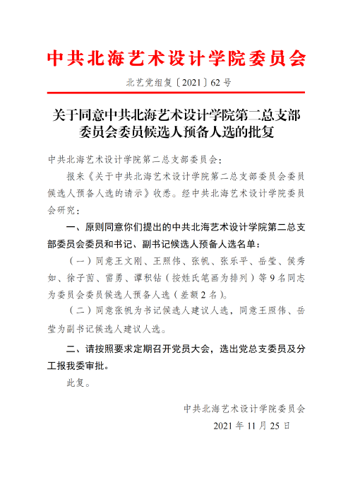 转发学校党委《关于同意中共北海艺术设计学院第二总支部委员会委员候选人预备人选的批复》