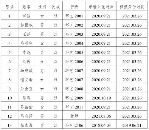 在征求党小组和党员、群众意见的基础上,经支部委员会审查,拟将郝骏等13位同志列为发展对象人选。根据发展党员工作有关要求,现将其有关情况公示如下,经党支部培养教育和考察,该同志已基本具备党员条件,在征求培养联系人、党员和群众意见的基础上,经中共北海艺术设计学院建筑与环境艺术学院学生第一支部委员会2022年10月11日讨论同意列为发展对象人选。