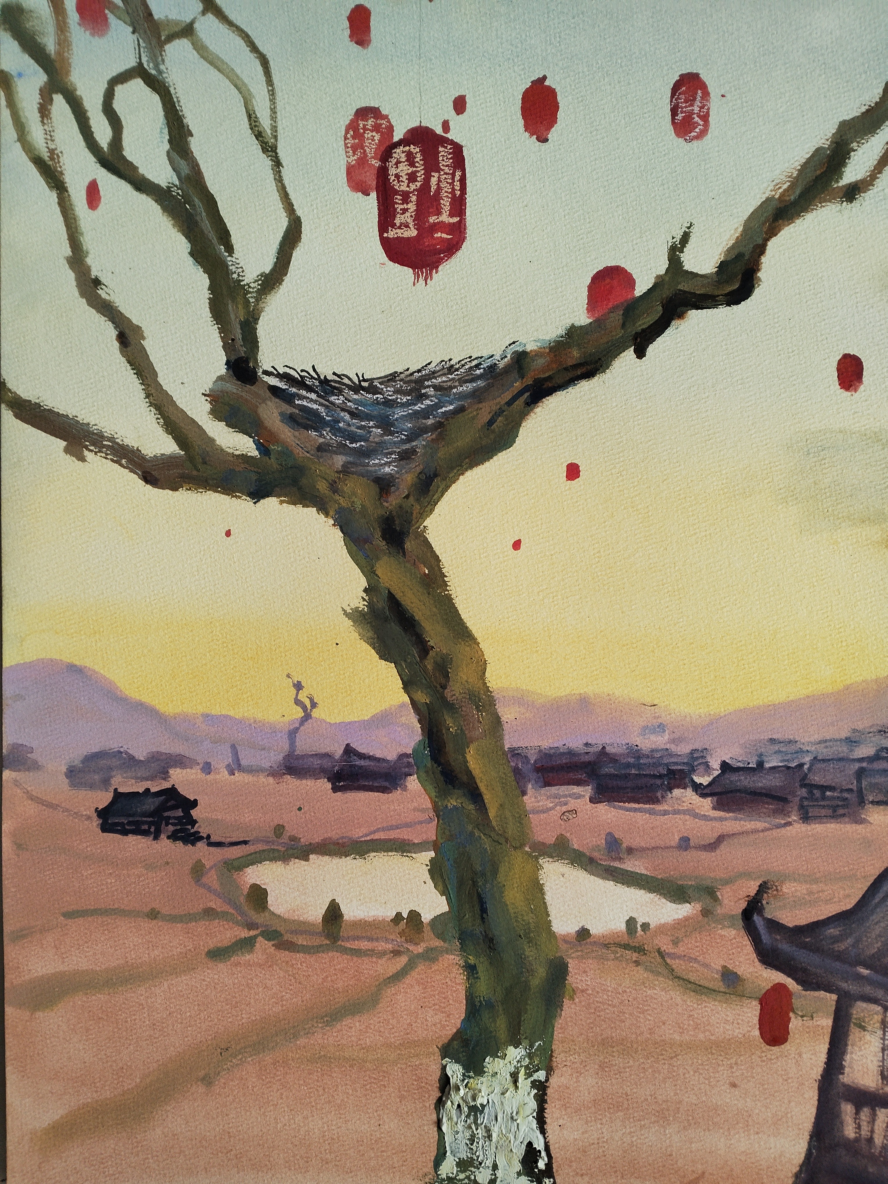 学生作品:美术学2401、02班,周添翼艺方客栈》,50cmX60cm