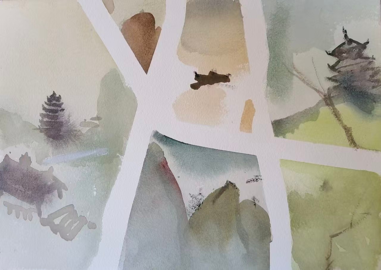 学生作品:美术学2407、08班,包敏玮水色侗居》,38cmX54cm