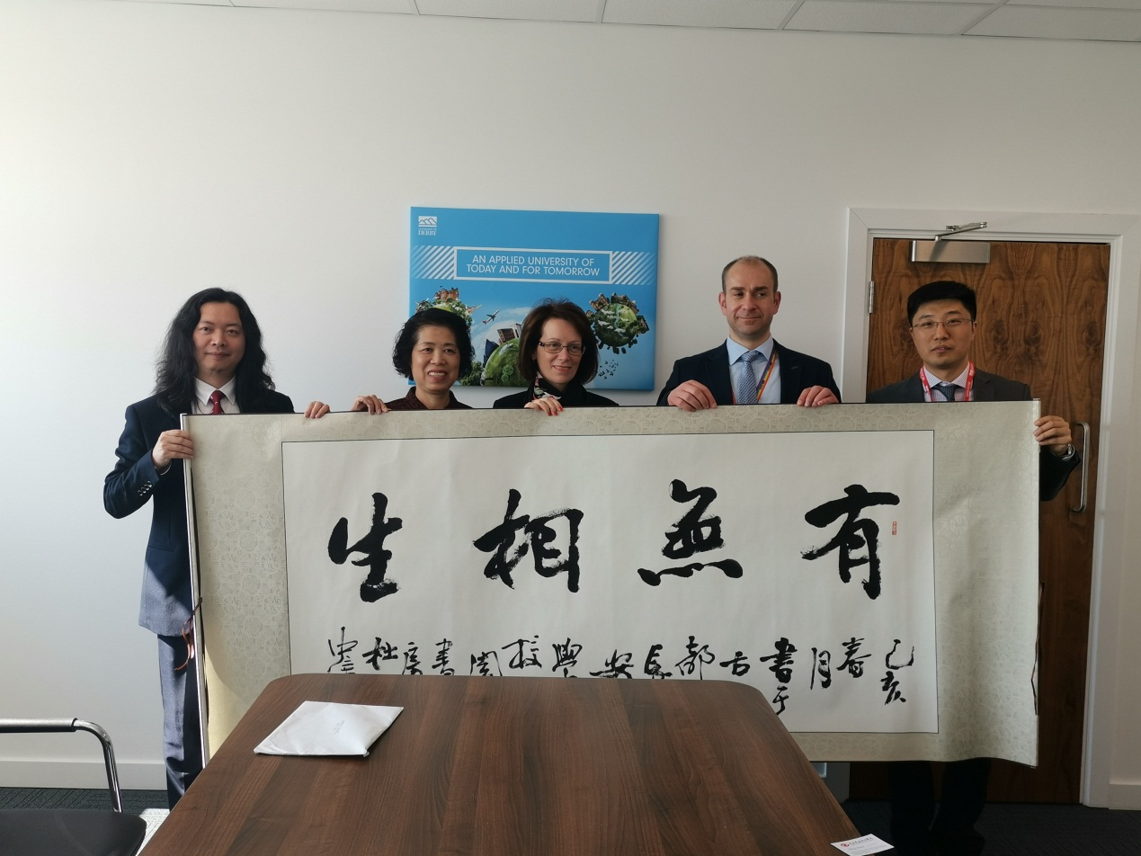 随后,张跃副校长代表我校向英国德比大学赠送我国著名书法家杜中信先生的书法作品《有无相生》,预示着两校间的合作从无到有,生生不息。