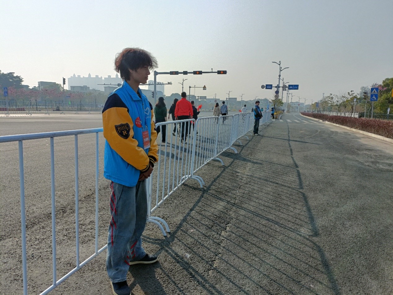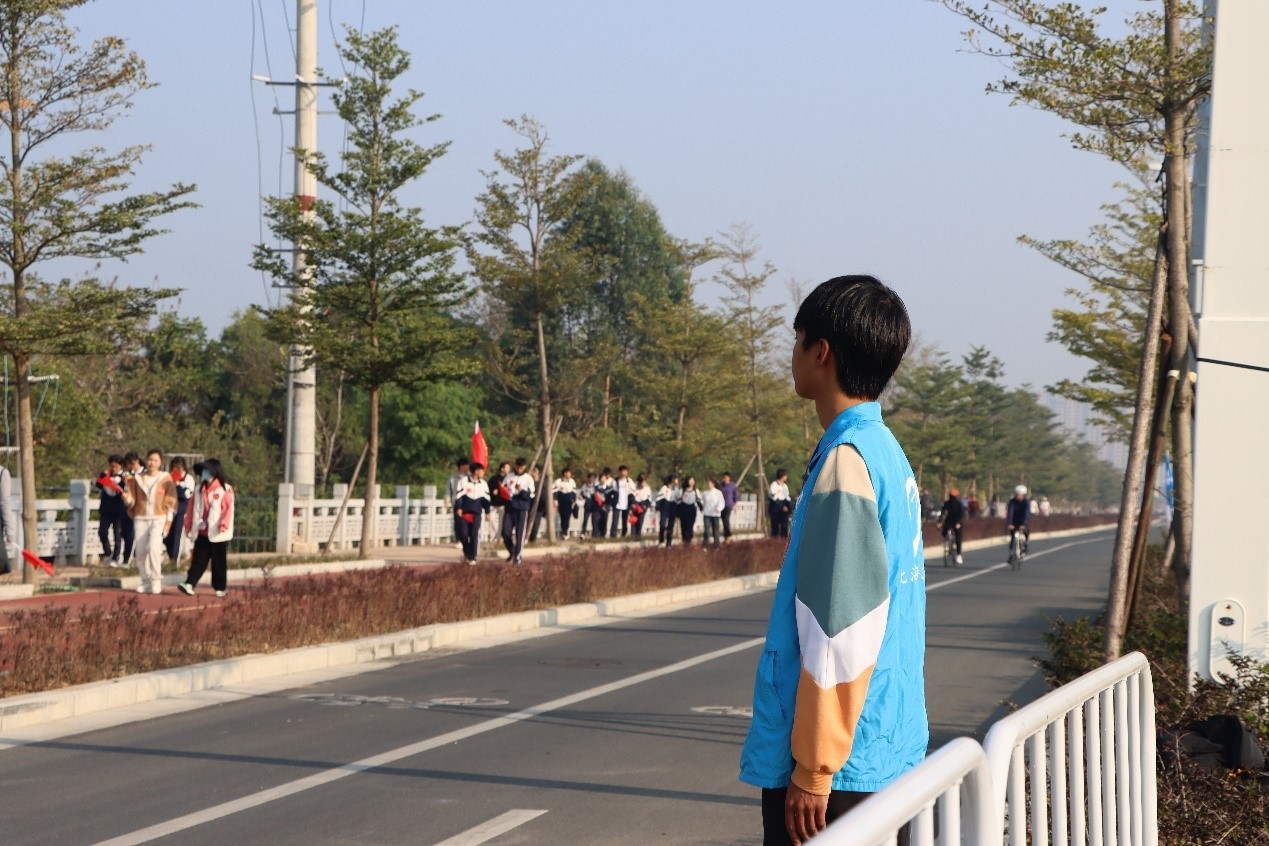 活动当天,志愿者们身着整齐醒目的蓝马甲,精神抖擞地奔赴各自岗位做赛前工作准备,温暖绚丽的光芒、秀丽的风光、志愿者们热情忙碌的场景瞬间定格,呈现出一幅绘有“热情、温暖、绿色、活力、责任”的唯美画卷。