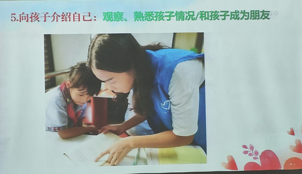 接着是向大家讲述志愿活动的准备:1.志愿者要保证良好的精神状态,穿着志愿者马甲。2.充分准备志愿活动材料以及样本 。3.维护课堂纪律、保证孩子们的安全。4.向孩子们介绍自己:观察熟悉孩子们,与他们成为朋友。5.确保孩子们回家的安全性。6. 拍照或者录视频记录 。7.志愿者意外险、志愿者补贴、服务证书、志愿者时长录入以及评优秀志愿者。最后,王柳妮秘书长表达自己对青年志愿者协会的美好祝愿,彰显作为志愿者的理想与信念。