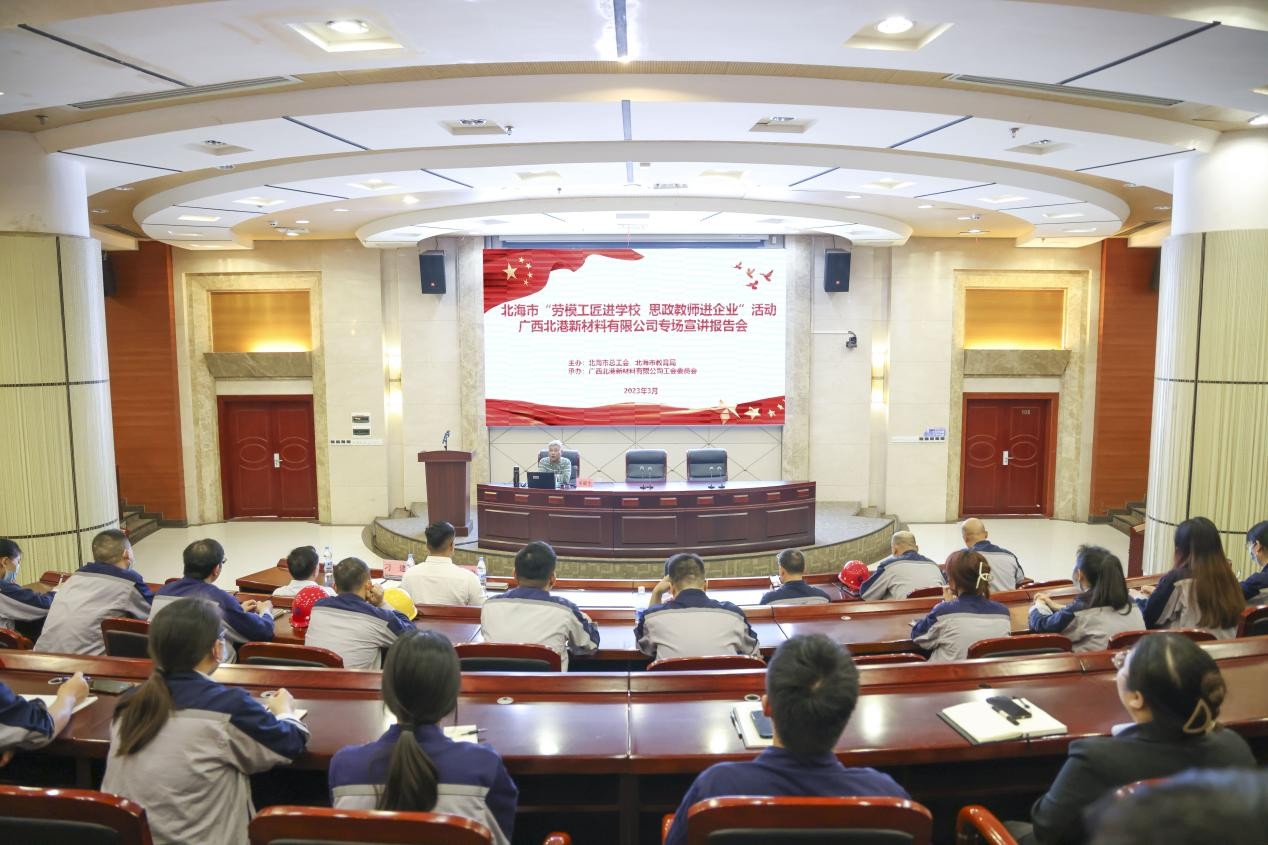 为大力弘扬劳模精神、劳动精神、工匠精神,充分发挥劳模工匠榜样示范作用和思政教师的专业优势,3月16日,由自治区总工会、北海市总工会主办北海艺术设计学院承办的“劳模工匠进学校 思政教师进企业”宣讲报告会活动走进北港永不锈书院。我校马克思主义学院院长姜献生教授、工会副主席郭巍同志应邀到企业进行现场宣讲,来自北港新材料各条战线的劳模工匠先进代表及一线职工代表80余人到场聆听。