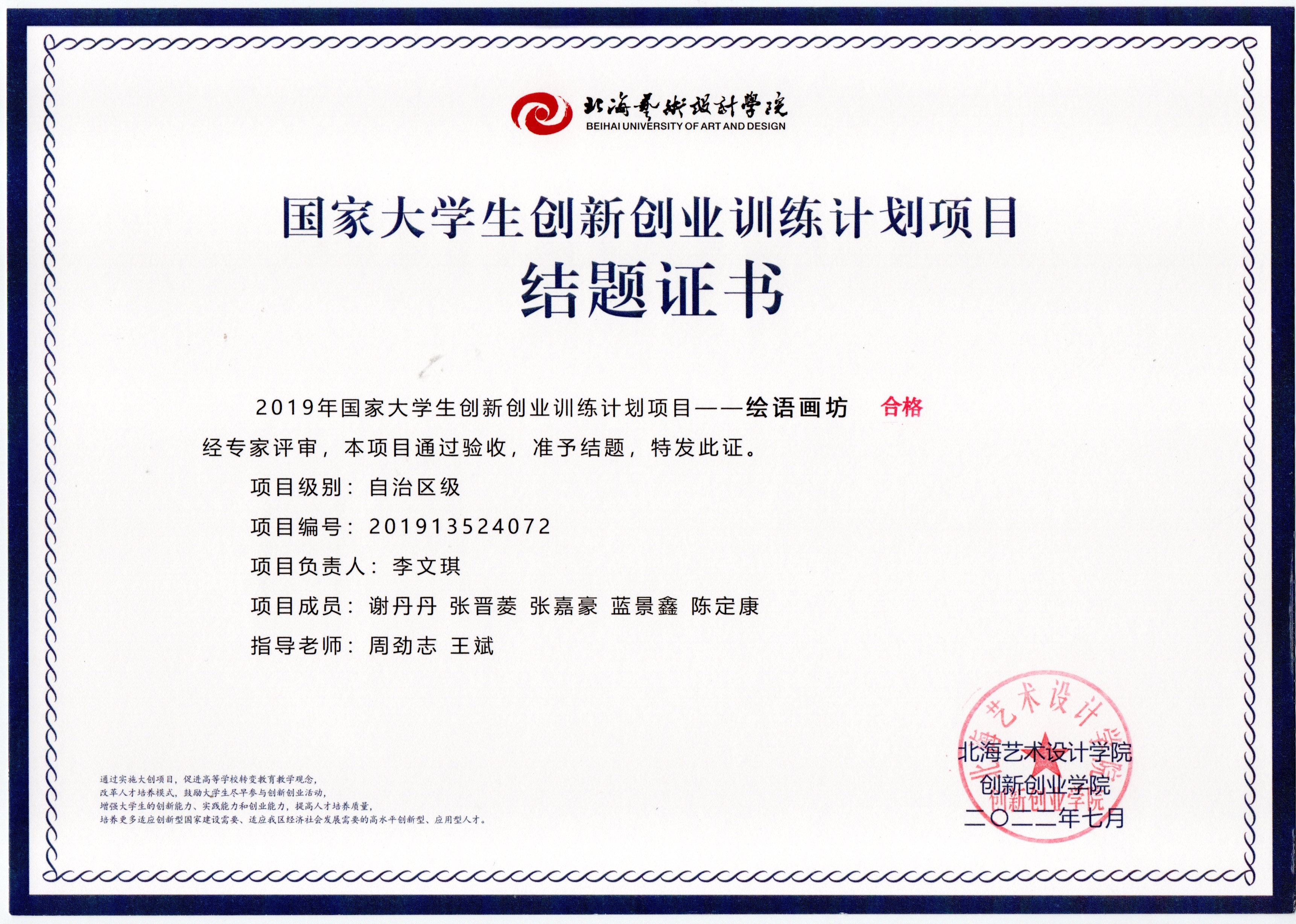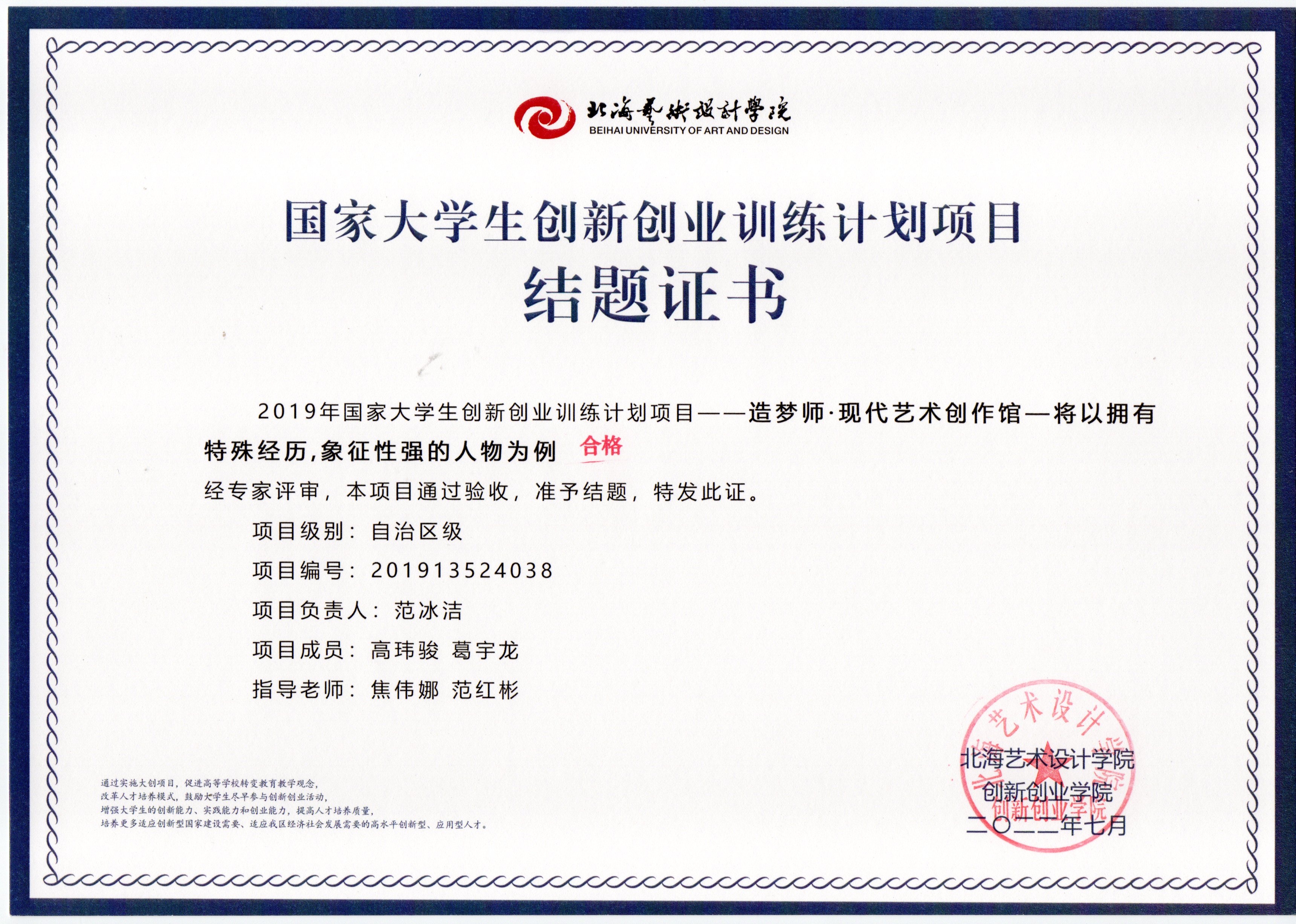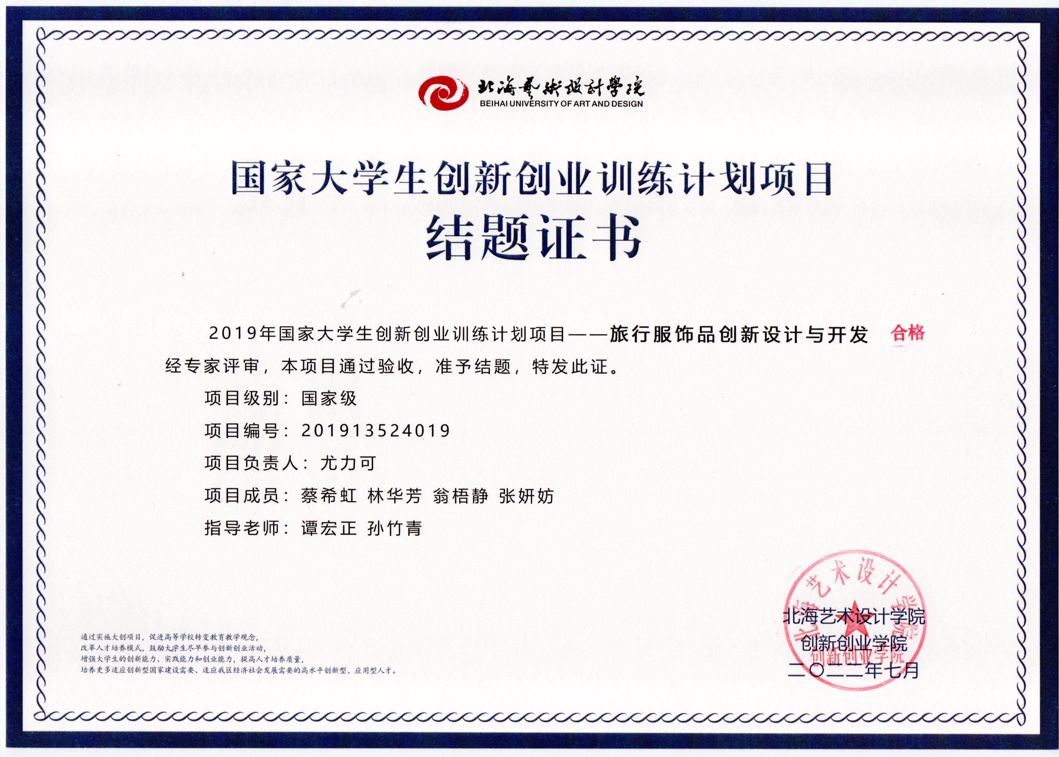 2022年大创项目结题证书(2019立项)