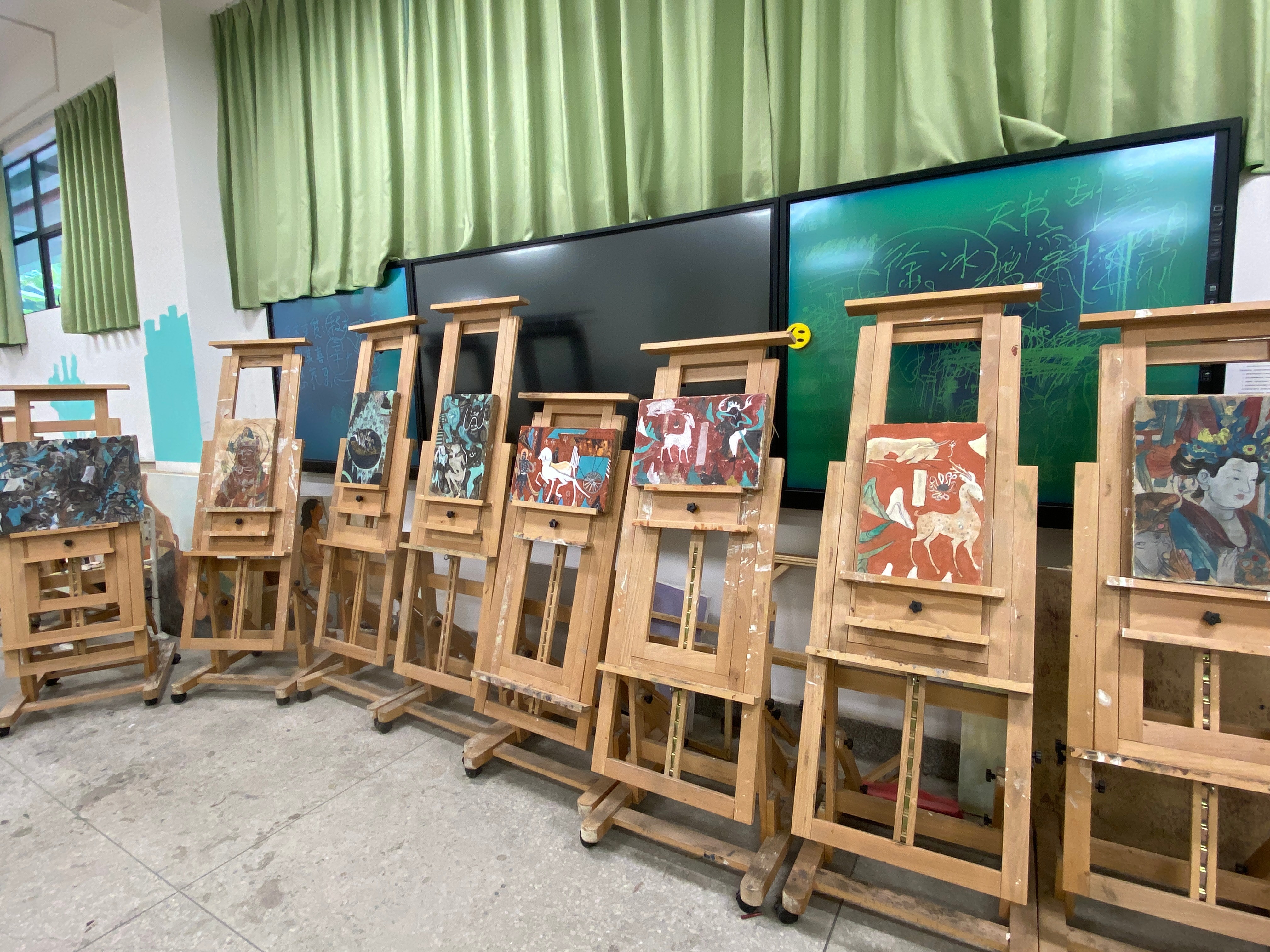 胡老师带着我们做地仗、模拟最真实的壁画体验,我们的作品也与原画同大,这都让我们更能深刻体会中国传统壁画绘画的语言表达。刚刚上手画的时候,我不太敢画,我们的画幅是最大的,但效果一直不强,导致我们小组出现明明应该是人多力量大却进度缓慢的问题。后来胡老师告诉我们254窟是北魏时期的,风格粗犷,可以大胆画一直鼓励我们引导我们大胆的表现,最后我明白完成比完美更重要。在初次上色时,我采用水彩技法里的平涂法铺色与壁画原作有着较大差距,胡老师后来告诉我们中国画要以线造型,用线找型,通过练习,我也逐渐感受到了中国画画法的独特魅力。
