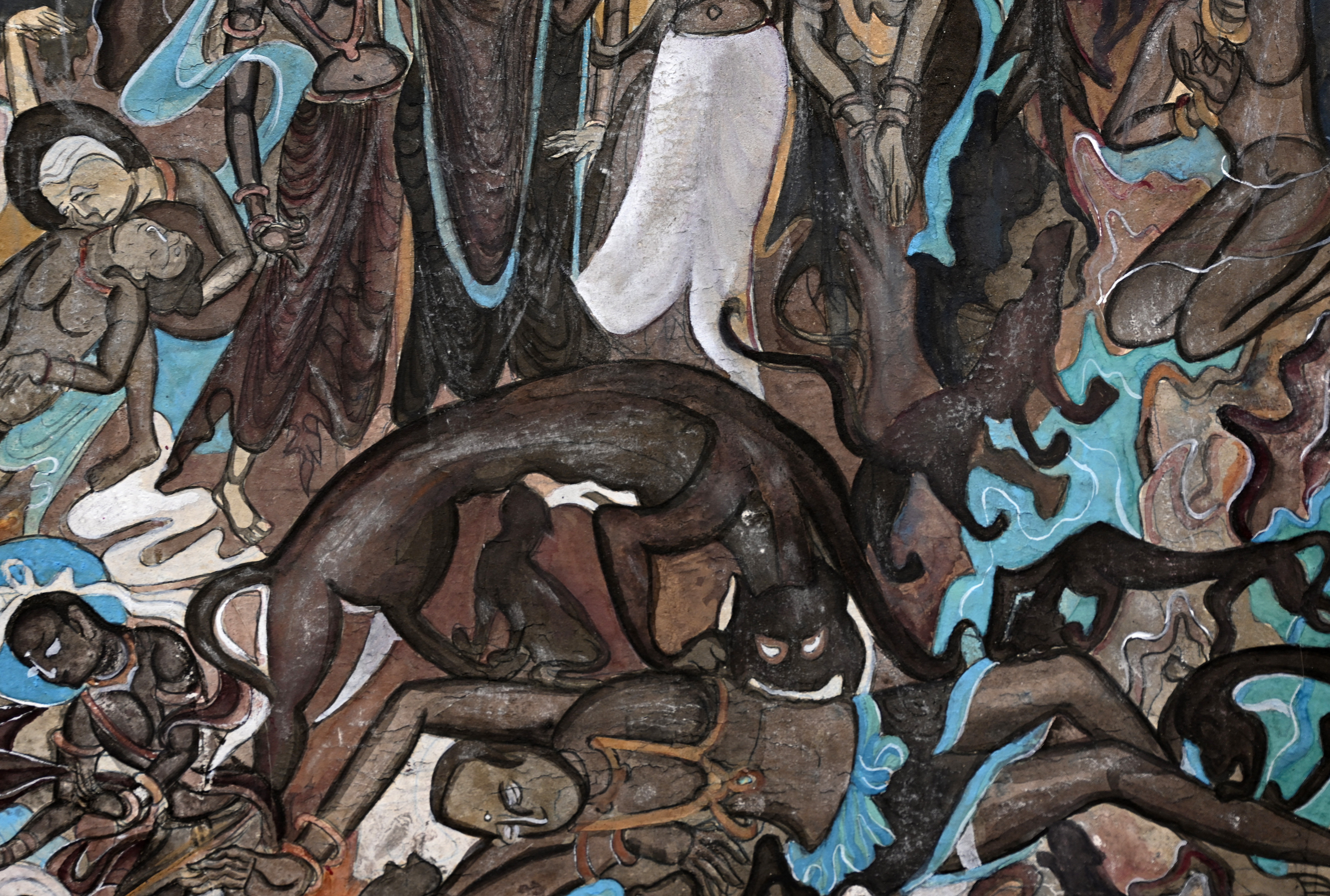 我们小组临摹的是敦煌莫高窟24窟的《割肉贸鹰》,本生故事,该幅壁画表现了尸毗王的功德,以及自我牺牲精神。与多见的单线型叙事逻辑不同,敦煌莫高窟打破了时间与空间,用切片等方式,一个图像表示着一个时间发生运动着的时空。