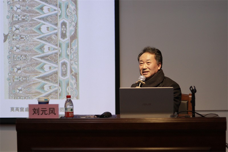讲座伊始,刘元风教授以一张老照片讲述曾经求学的历程引入讲座内容。他通过展示与敦煌有关的图案以及敦煌彩窟菩萨裙饰在现代布料与现代服装上的应用,讲述他运用敦煌纹样设计的作品参加香港时装文化节,运用莫高窟盛唐第31窟藻井图案中的汲取元素所设计的工作服等丰富的工作经历,具体讲解了敦煌服饰的艺术与传承。