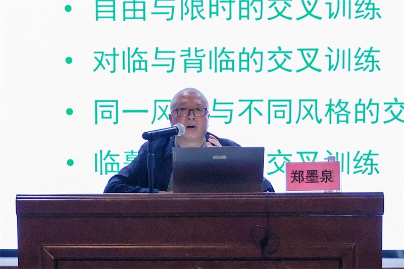 讲座过程中,郑墨泉教授围绕十个核心专题系统展开,指出书法临摹是手段,创作是目的,二者循环促进,才能实现个人书法表达。他直指临摹在书法学习中的基础性作用,强调临摹是通向创作的必经途径,临摹方向偏差则创作必然偏离正轨。郑墨泉教授提出,“理通、力遒、形美、韵胜”四大维度共同构成书法学习的核心审美标准,为现场师生建立了清晰的艺术评判框架。