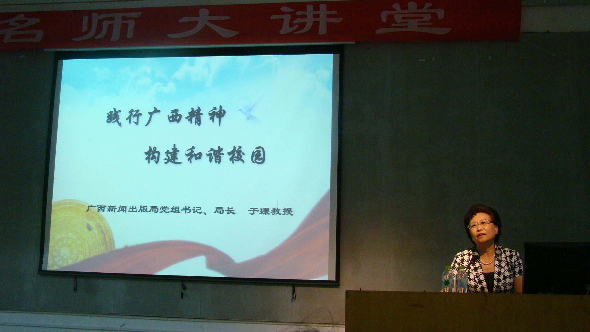 2013年6月14日上午, 我院“名师大讲堂”非常荣幸地邀请到广西新闻出版局党组书记、局长于瑮教授为我院师生作了题为“践行广西精神,建构和谐校园”的主题报告会。学院党委贺祖祯书记主持报告会。