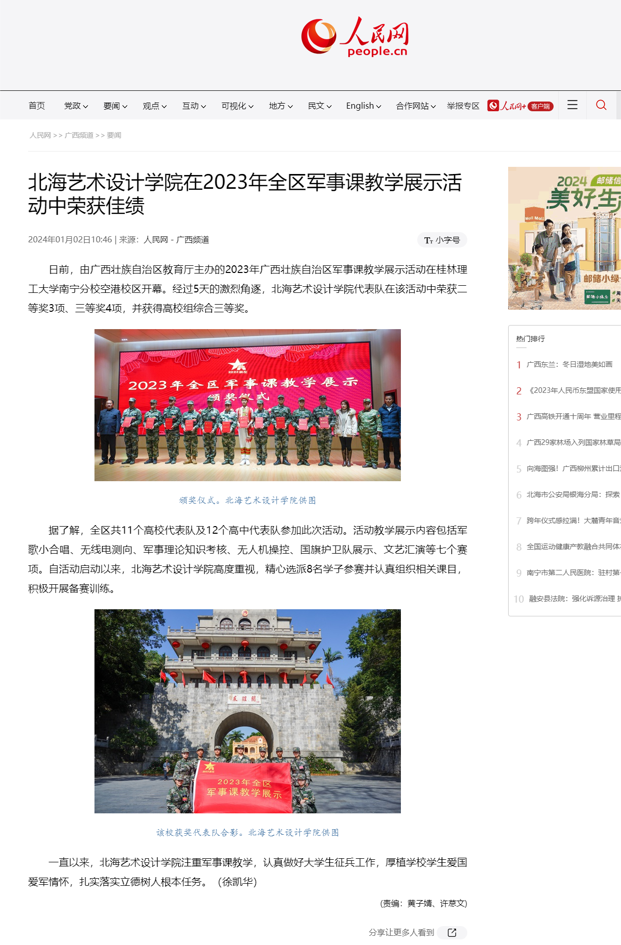 人民网:北海艺术设计学院在2023年全区军事课教学展示活动中荣获佳绩