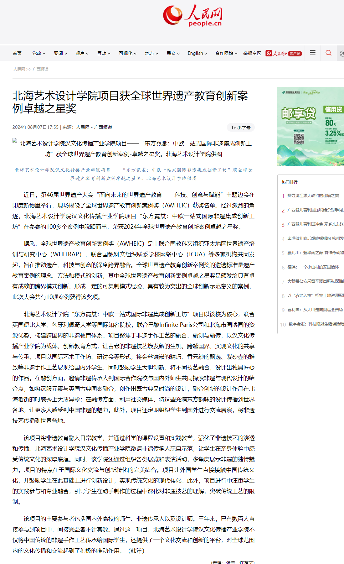 人民网:北海艺术设计学院项目获全球世界遗产教育创新案例卓越之星奖
