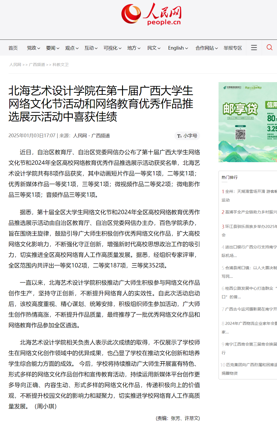 人民网:北海艺术设计学院在第十届广西大学生网络文化节活动和网络教育优秀作品推选展示活动中喜获佳绩