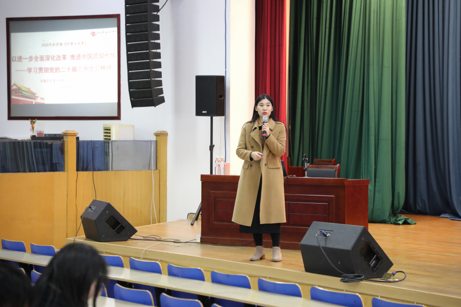 此次授课安排《以进一步全面深化改革推进中国式现代化——学习党的二十届三中全会精神》《发展新质生产力,推动时代新发展》两个专题进行授课,结合当前社会形势和大学生实际,通过生动的案例和深入浅出的讲解,向学生们传授了新知识、新思想和新观念。