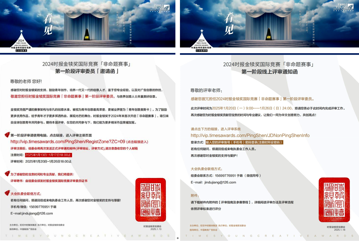 2024金犊奖国际竞赛是由中国时报创办,中国商务广告协会指导的一项全球华文青年创意大赛,其合作单位有北京大学新媒体营销传播研究中心(CCM)、新华网、海峡两岸互联网交流委员会。其非命题赛事评审委员会由来自全国各地的专业设计师、高校专业教师等组成,作为评委需助力完成本赛事第一阶段的线上评审工作,此阶段的评审于2025年1月20日开始至2025年1月26日结束,此项工作对大赛的圆满完成起到了重要的推动作用。​