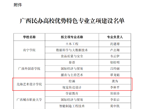 近日,广西壮族自治区教育厅下发《自治区教育厅关于公布广西民办高校优势特色专业建设项目立项名单的通知》(桂教民办〔2022〕15号),公布了2022年度广西民办高校优势特色专业立项建设名单。我校绘画和视觉传达设计专业入选。