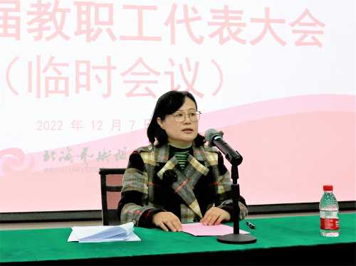党委书记张阳在讲话中表示教代会是学校民主管理的具体体现,是教职工代表为开创学校工作的新局面集思广益、献言献策和认真履行权利和义务的有效途径。一直以来,我校教代会充分发挥了推进学校民主化、法制化建设的作用,有效推进了学校科学化管理。她指出了此次选择学校登记工作的重要性,高度肯定了学校举办者公益办学的初心,表明了学校党委坚决支持举办者和董事会选择登记为“非营利民办学校”的决议,描绘了学校选择“非营利学校”后的美好前景。她强调,当前学校本科教学工作合格评估已经到了关键期,要严格按照“以评促建、以评促改、以评促管、评建结合”的要求,做好评估各项工作,持续推动学校进一步规范化管理。广大教职工要把学习宣传贯彻党的二十大精神作为当前和今后一段时间的首要政治任务,认真贯彻办好人民满意教育的重要指示精神,深入实施科教兴国战略,坚持为党育人、为国育才,同心同德,通力合作,携手共进,共同为党和国家的教育事业高质量发展跨上新台阶、持续铸就新辉煌贡献北艺力量。