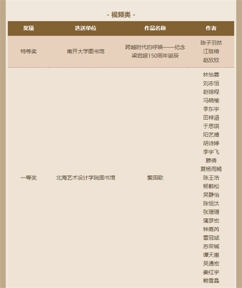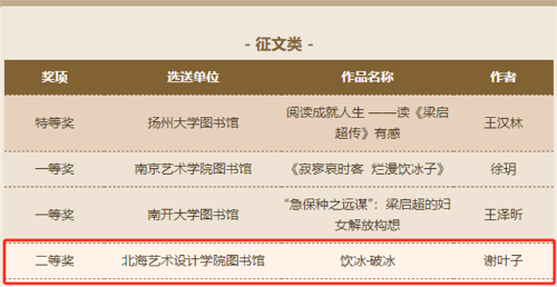 近日,由天津市全民阅读活动办公室、天津高等学校图书情报工作委员会、江苏省高等学校图书情报工作委员会主办的“品读梁启超 阅读创作大赛”的活动线上发布了获奖名单。我校学生作品征文类获得二等奖1名、优秀奖2名;书画类获得一等奖1名、三等奖2名、优秀奖6名;视频类获得一等奖1项、二等奖1项、三等奖4项、优秀奖5项。我校图书馆被评为“经典推广先进单位”“优秀组织单位奖”,学校教师喻广林、熊东等获优秀指导老师奖。