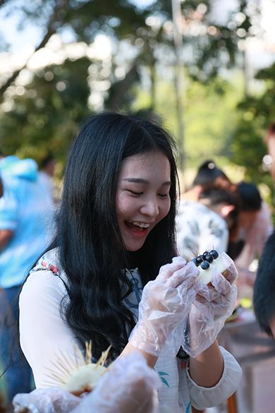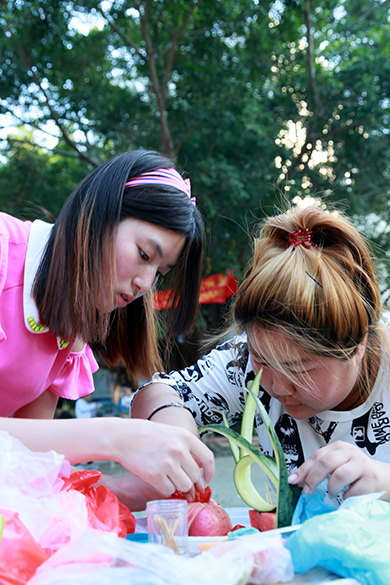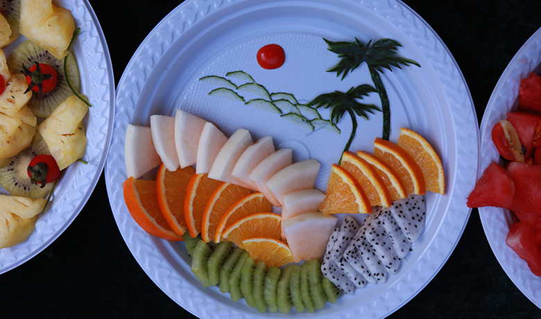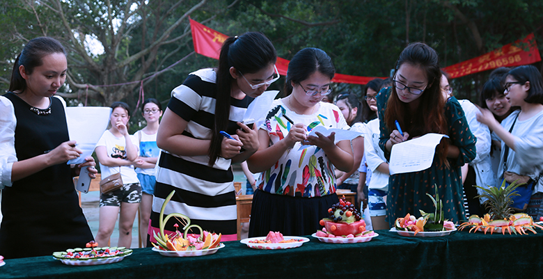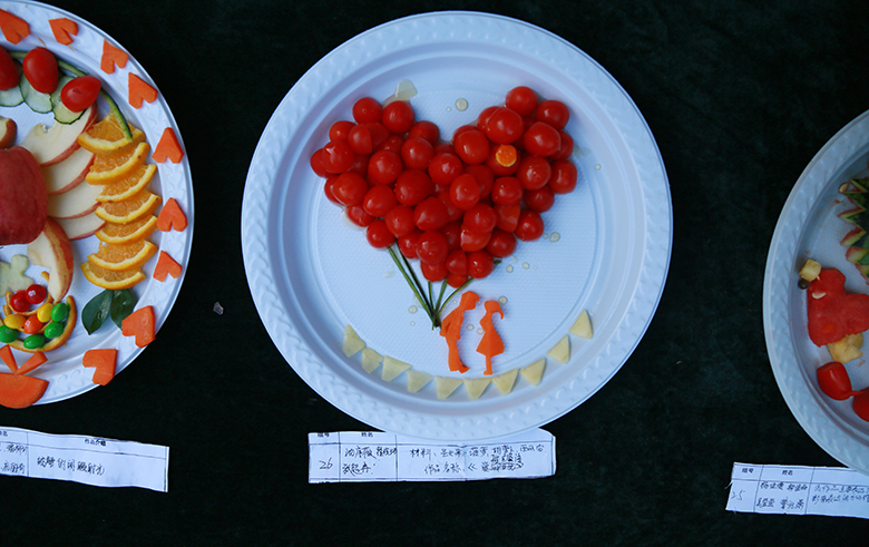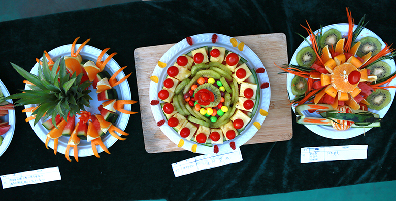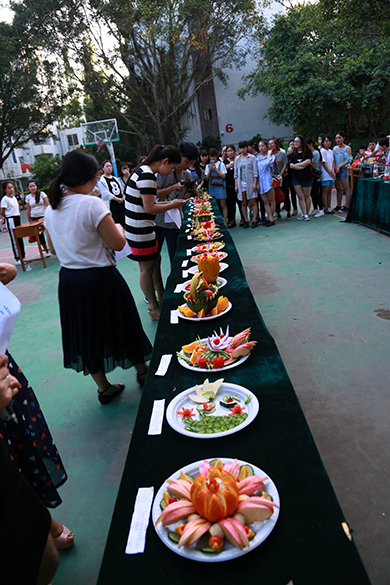 在正值天气炎热的下午,比赛如火如荼的展开。同学们热情高涨活力无限,活动有40组队伍分两轮进行,每轮时间均为30分钟,每轮比赛结束后评委随即现场评分。本次活动同学们充分发挥了自己的想象力和创造力,各种创意和妙想层出不穷,各小组认真实践自己的创意,高质量地完成水果的切拼、造型及水果拼盘主题设计制作,其中有不少作品令人惊喜赞叹。