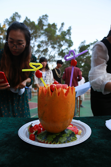 2015年4月29日,在艳阳似火的下午,整个校园却好似浸泡在甜爽的水果海洋中,2015校园文化艺术节水果拼盘大赛在篮球场上火热进行。出席本次活动领导老师有学院党委副书记、副院长彭仁,学工处处长刘承初,团委书记杜博,学工处副处长、设计学院学工办主任庞定坤,动画学院学工办主任何煜,团委副书记文春明以及班媚、刘玲花、严腾、张帆等四位评委老师。