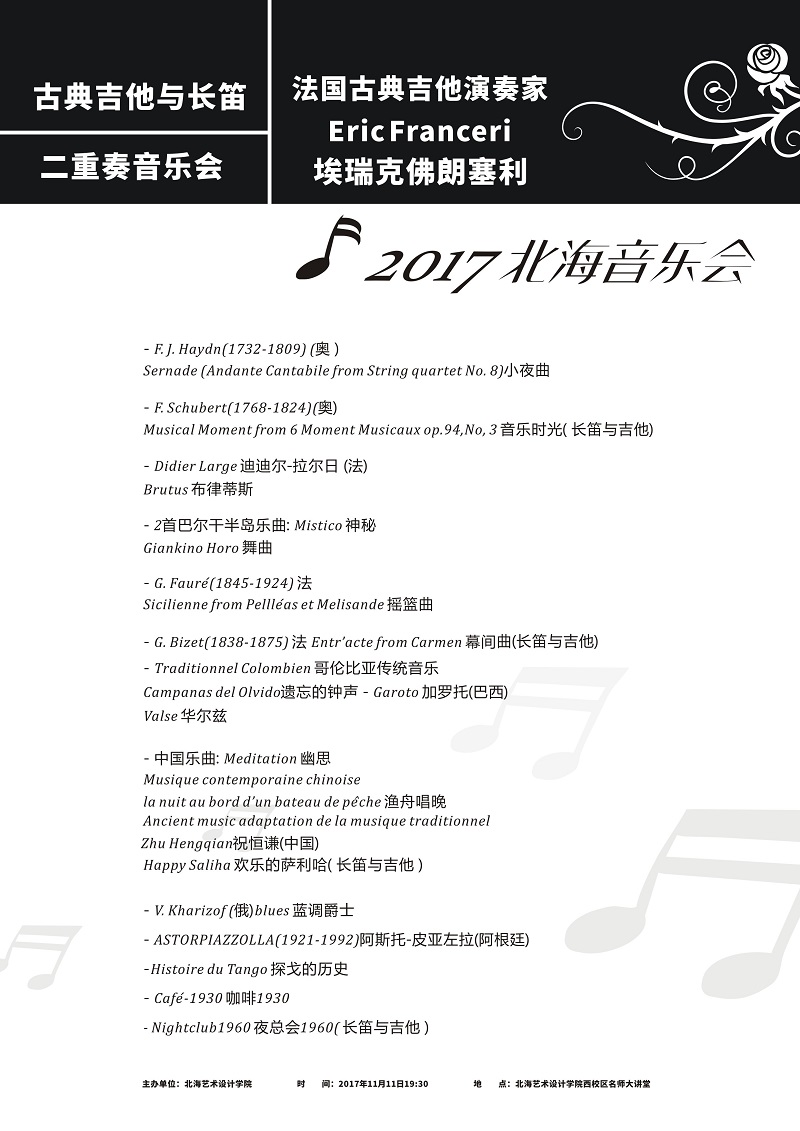 2017年11月11日晚,在我院西校区大礼堂举行了一场期待已久的音乐盛会。我院特邀法国古典吉他演奏家埃瑞克·佛朗塞利和旅法长笛演奏家郝雪雯两位艺术家联袂登台,为师生奉献一场精彩的古典吉他与长笛二重奏音乐会。