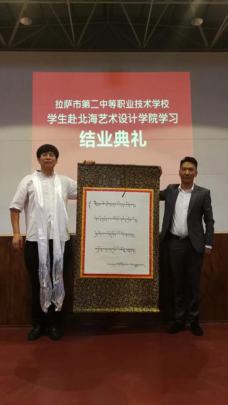 据悉,典礼上, 拉萨市第二中等职业技术学校带队老师边巴塔杰还特别准备了书法作品赠送给我校执行董事郑超。