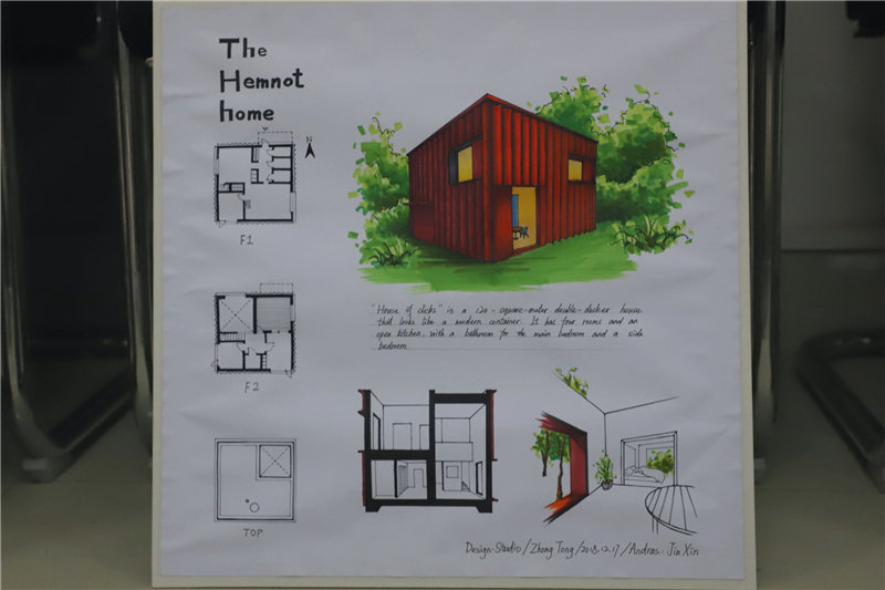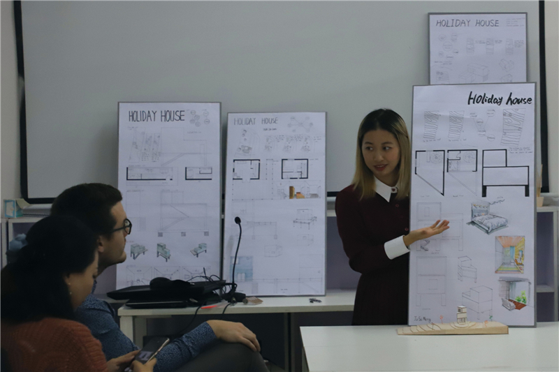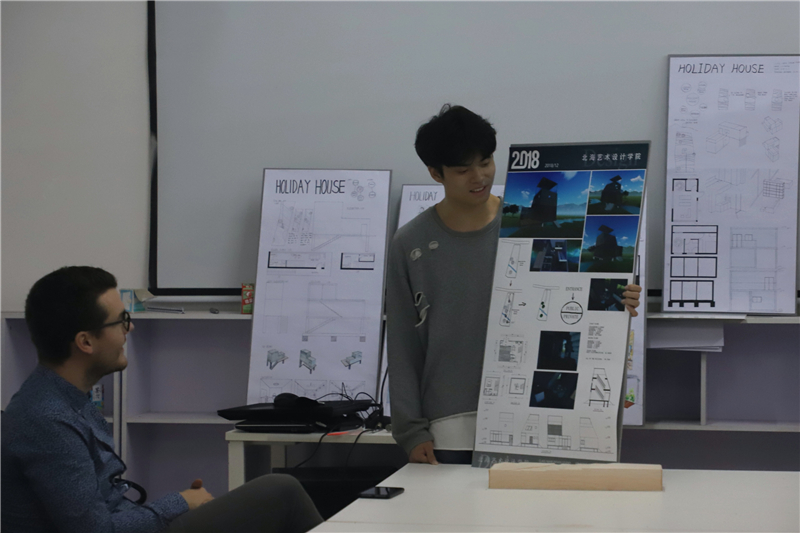 国际班的罗慧婷同学率先进行作品《HOLIDAY HOUSE》的展示汇报。接下来温瑞秋、常奇明、霍晋东、仲彤、琚司蒙、曾宏六位同学也依次携作品《VACATION》、《Building Eyes》、《HOLIDAY HOUSE》、《HOLIDAY HOUSE》、《Holiday House》、《An Interesting Buiing》进行了各自的展示汇报。让官微君印象深刻的是常奇名同学的作品,他在介绍自己的建筑设计方案时提到:“因为屋顶与地面平行,我的建筑是和整个森林、整个世界融为一体的,而不是那么突出显眼。我的建筑三个面都是玻璃,有着更宏大的视野,给人一种更贴近自然的感觉。”生动展现了他设计中的自然和谐气息概念。