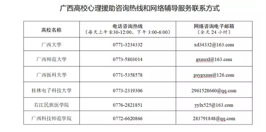 为帮助我区社会大众和广大师生以更加理性平和的心态应对新型冠状病毒感染的肺炎疫情,中共广西壮族自治区委员会教育工作委员会、广西壮族自治区教育厅组织区内有关高校心理健康教育与咨询中心的专家教授组成专业的心理支持团队,在疫情防控期间为我区社会大众和广大师生免费提供心理援助电话咨询和网络辅导服务。