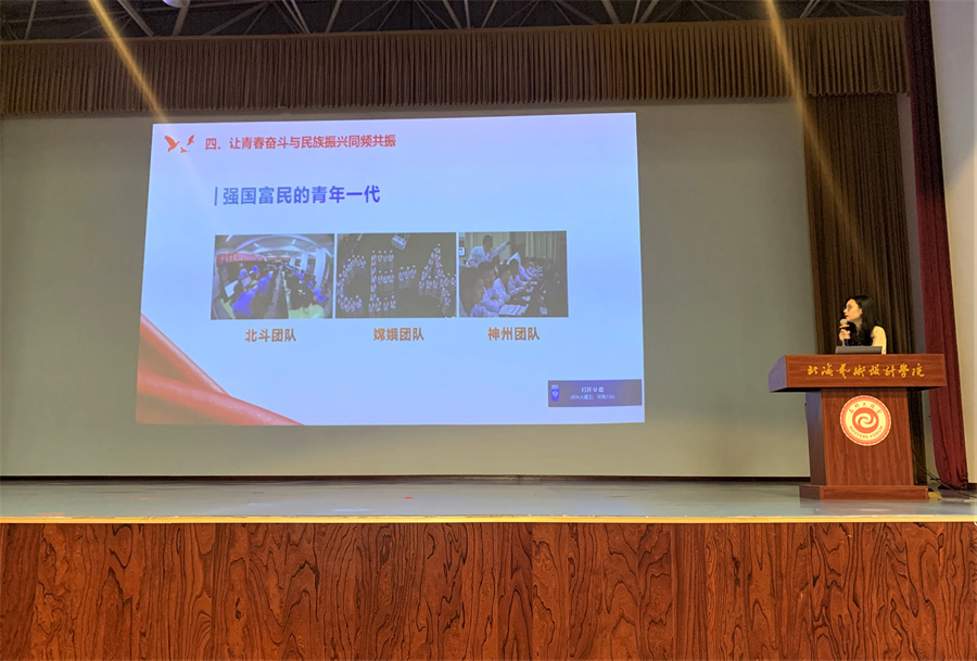 动画与传媒学院党总支书记孙永辉以学院自行创作的动画短片《半条被子》、及学院教师带领学院学生团队拍摄的学校首部微电影《唱给海的歌》为切入点,向同学们分享了创作的初衷和拍摄的趣事,以及怎样将红色主题元素融入到具体教学、专业活动、作品内容中,勉励同学们学好专业技能的同时,注重政治理论学习,加强自我修养,关注民生大事,利用自身专业优势当好中国文化、广西发展、北海故事、北艺故事的传播者和讲述人,做有理想有抱负有担当的追梦人。