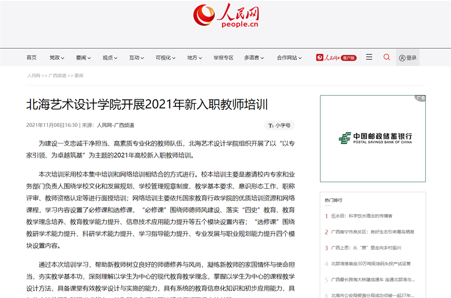 11月8日,人民网以《北海艺术设计学院开展2021年新入职教师培训》为题,报道我校组织开展的2021年高校新入职教师培训。学校重视教师队伍的培养培训,通过系统化、专业化的学习培训,帮助新教师尽快了解和适应工作岗位,着力打造师德高尚、业务精湛、结构合理、活力充沛的高素质专业化创新型教师队伍。