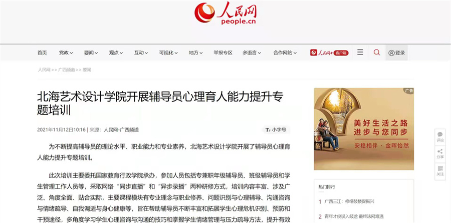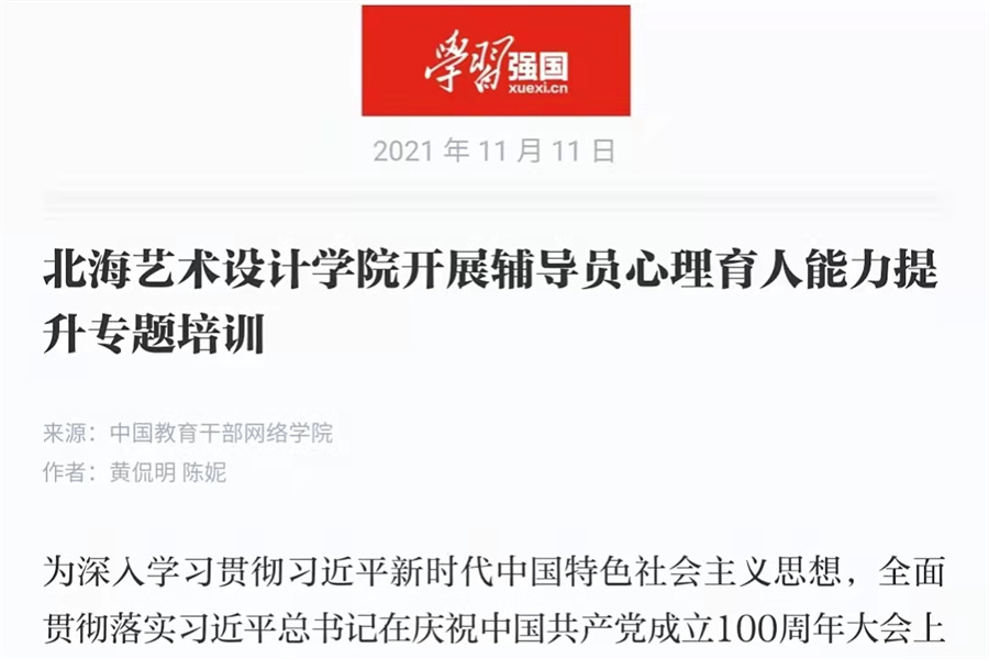 近日,学习强国和人民网两大平台以《北海艺术设计学院开展辅导员心理育人能力提升专题培训》为题,同步报道我校开展的辅导员心理育人能力提升专题培训活动。一直以来,我校重视辅导员队伍的建设和辅导员育人能力的提升,开展各项辅导员相关专题培训活动,培训内容涉及领域广泛,角度全面且贴合实际,帮助辅导员全面提升个人综合素质,助力学校不断加强和改进新时代大学生的思想政治工作教育和管理。