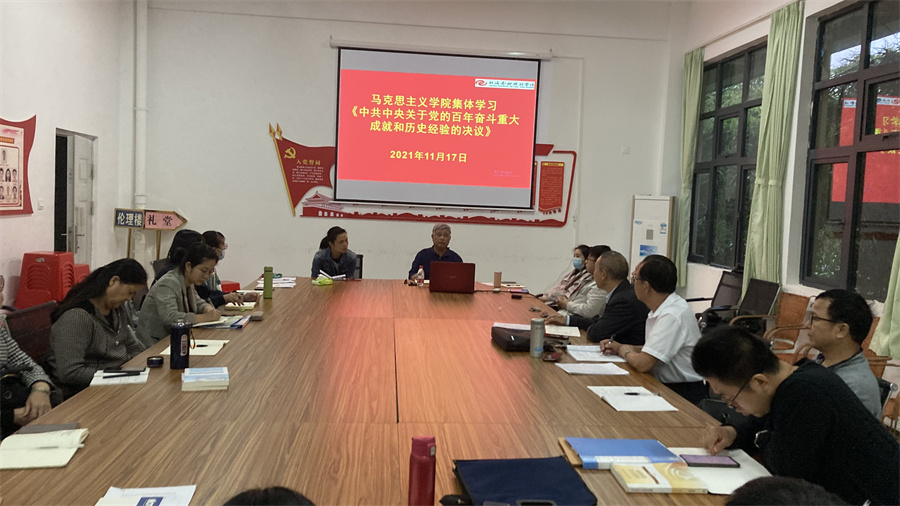 2021年11月17日,马克思主义学院全体教师在行政楼111室集中学习11月11日中共十九届六中全会通过的《中共中央关于党的百年奋斗重大成就和历史经验的决议》。学习会议由马克思主义学院院长姜献生组织。