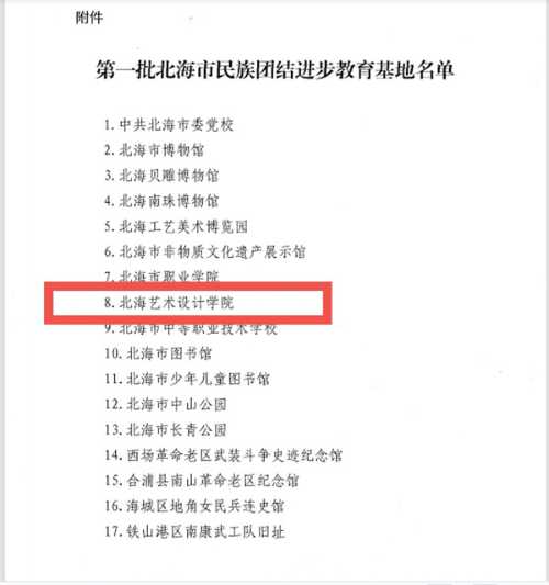 近日,根据中共北海市委统战部、中共北海市委宣传部公布的第一批北海市民族团结进步教育基地和第三批北海市民族团结进步示范区示范单位名单,北海艺术设计学院被确定入选为第一批北海市民族团结进步教育基地及第三批北海市民族团结进步示范区示范单位。