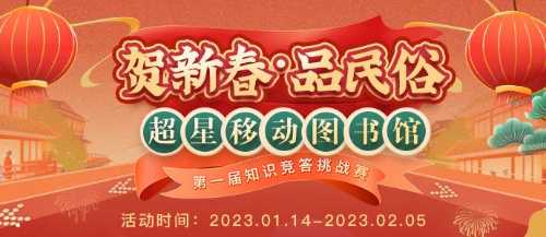值此新春佳节之际,我馆特组织广大师生参加“贺新春 品民俗”超星移动图书馆知识竞答挑战赛,欢迎大家积极参与,让我们一起感受浓厚的新春佳节氛围吧!