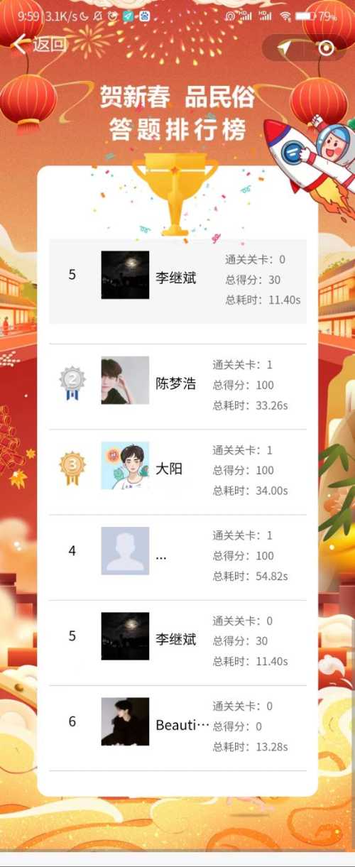 排行规则:本关排行:依次为本关分数、本关耗时、答题时间(答题早的在前),多次通关取最高分,相同分数取用时最短;总排行:依次为通关关卡、通关总分数、通关总耗时、答题时间(答题早的在前)。