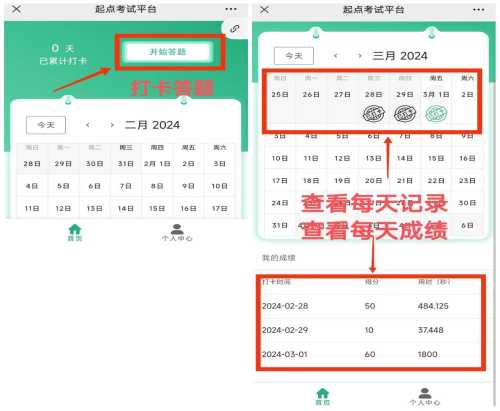 同学们进入平台后需先注册,填写本人所在学校、院系、学号、个人姓名、联系方式,以便成绩统计,通知领取奖品。(已经注册过“起点考试网”账号或参加过往届竞赛活动的同学们,无需注册,直接账号登录即可。)完成注册后进入打卡页面,点击“开始答题”作答交卷即可,记得坚持每天打卡哦!
