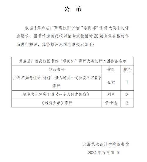 第六届广西高校图书馆“学问杯”影评大赛初评入围名单公示