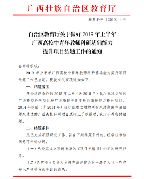 自治区关于教育厅关于做好2019年上半年广西高校中青年教师科研基础能力提升项目结题工作的通知