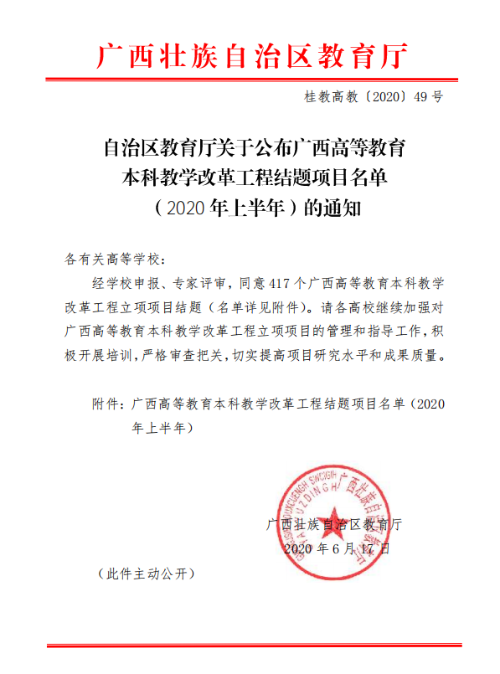 自治区教育厅关于公布2020年度 广西高等教育本科教学改革 工程项目结题工作的通知