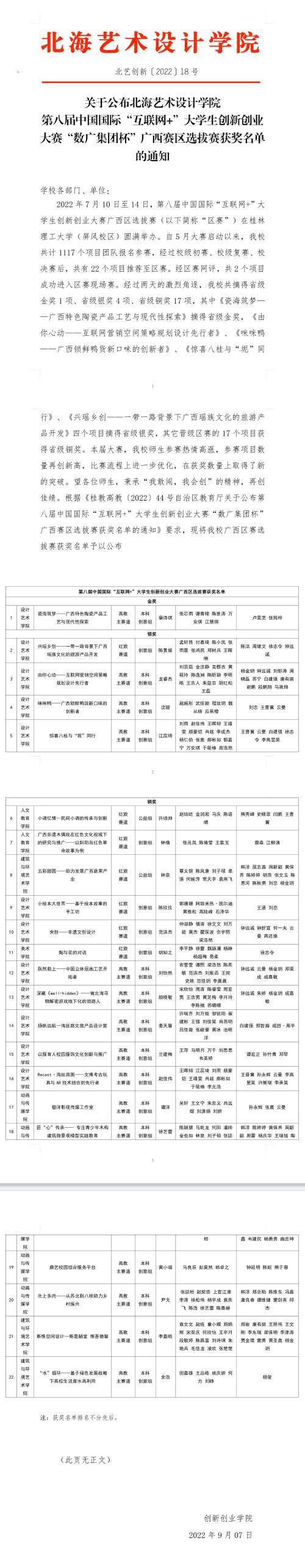 关于公布北海艺术设计学院 第八届中国国际“互联网+”大学生创新创业大赛“数广集团杯”广西赛区选拔赛获奖名单的通知