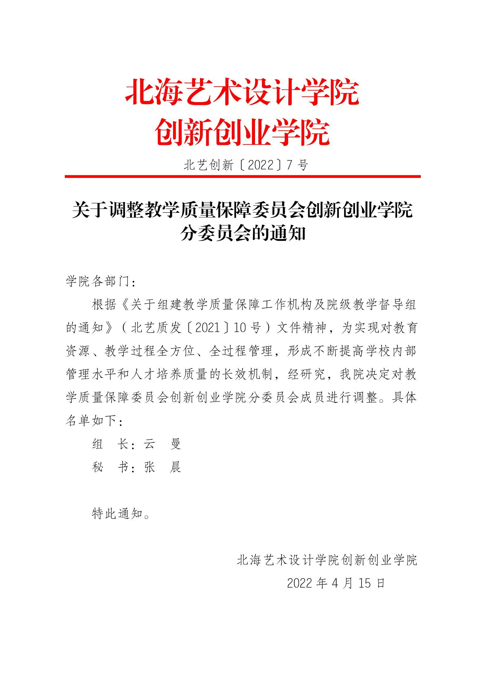 北艺创新〔2022〕7号关于调整教学质量保障委员会创新创业学院分委员会的通知