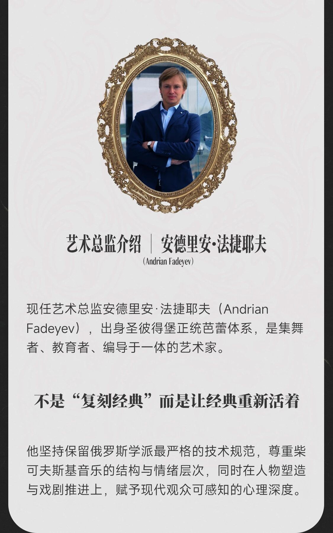 如果说《天鹅湖》是世界芭蕾的“原点”,那么圣彼得堡,便是这部作品的精神故乡。圣彼得堡国立模范芭蕾舞团,亦称雅各布森芭蕾舞团,创建于1966年,由20世纪最具个性的俄罗斯编舞大师之一—— 列昂尼德·雅各布森创立。
