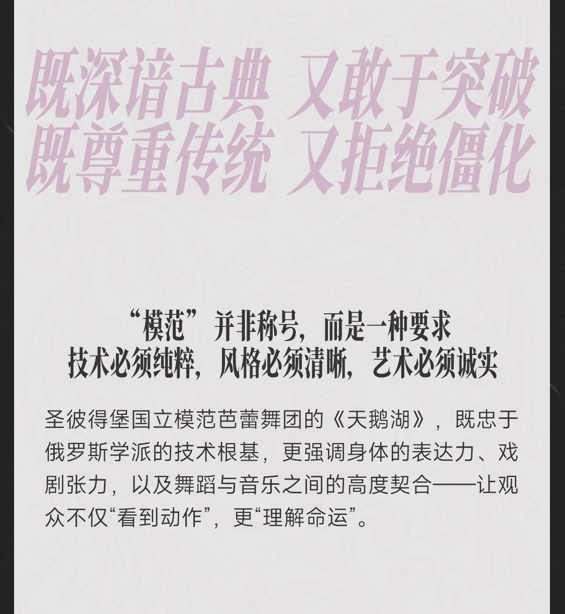 圣彼得堡国立模范芭蕾舞团的《天鹅湖》,既忠于俄罗斯学派的技术根基,更强调身体的表达力、戏剧张力,以及舞蹈与音乐之间的高度契合——让观众不仅“看到动作”,更“理解命运”。
