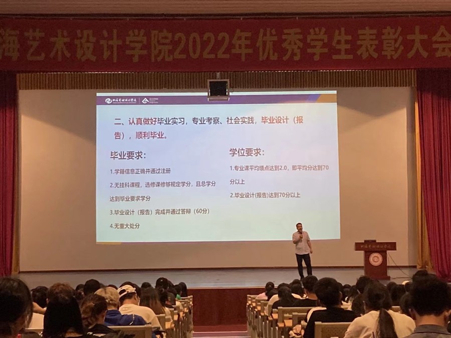 2022年6月8日晚,设计艺术学院2019级学生离校上京动员会在西校区大礼堂举行。会议由学院院长李林平主讲,学工办主任曲忠成主持,2019级全体辅导员和学生参加。
