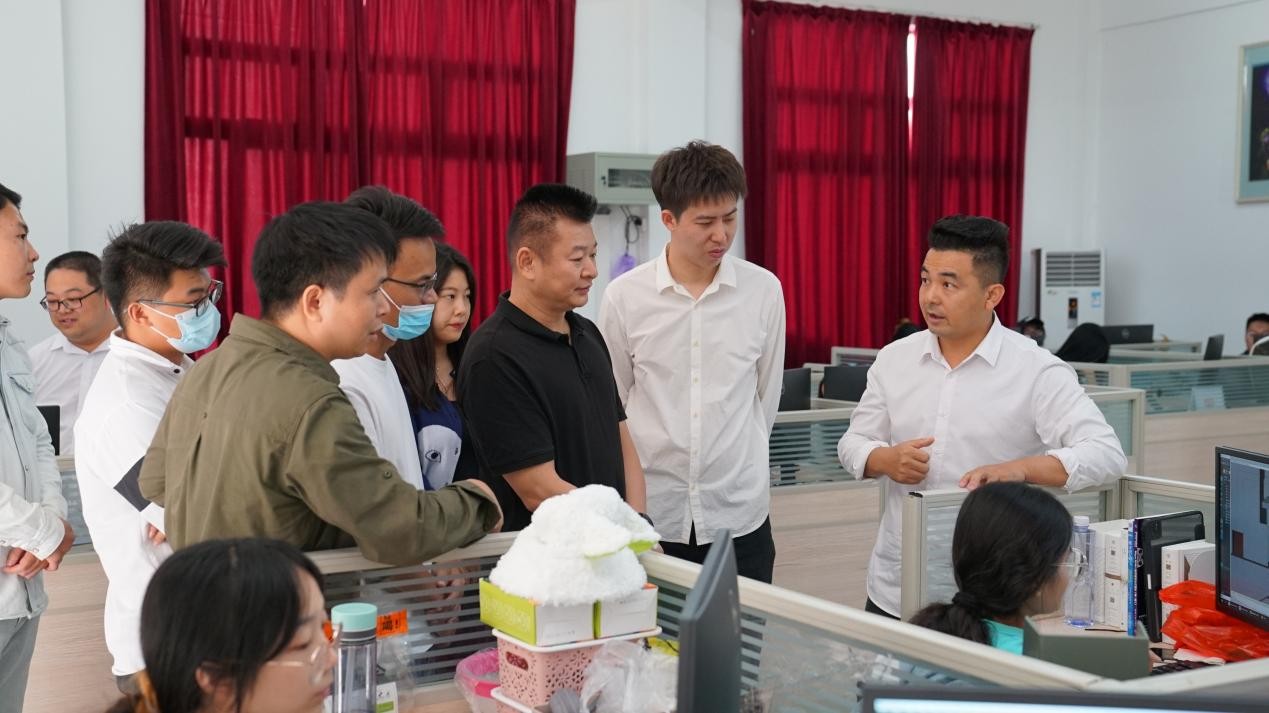 在综合楼动画实验室,孙永辉院长介绍实验室中正在参与动画项目实训的学生们的情况。在综合楼渲染实验室,刘涛主任和梁达锦副主任介绍了渲染机器设备以及正在渲染中的作品。在综合楼设备室,负责人陈蔓延老师向企业介绍和展示学院供学生实践使用的拍摄设备。在3D打印工作室,工作室负责人冯兆丹老师介绍了工作室近年来的发展成果,展示了学生优秀作品。在小卷工作室,刘涛主任介绍了教学成果及学生实践情况。随后,校企双方在综合楼演播厅观看了北海艺术设计学院宣传片。
