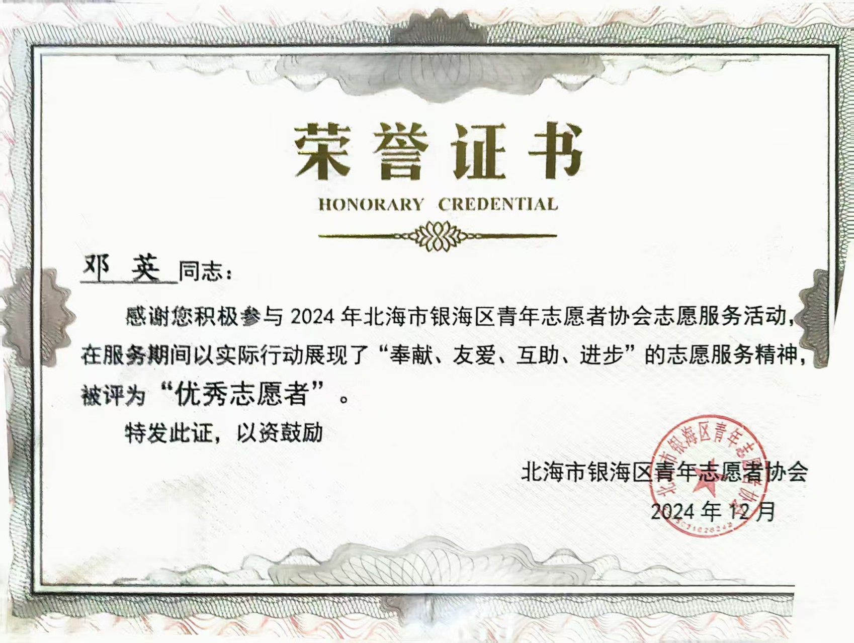 2024年12月 在北海市银海区青年志愿者协会志愿服务活动中被评为“优秀志愿者”;