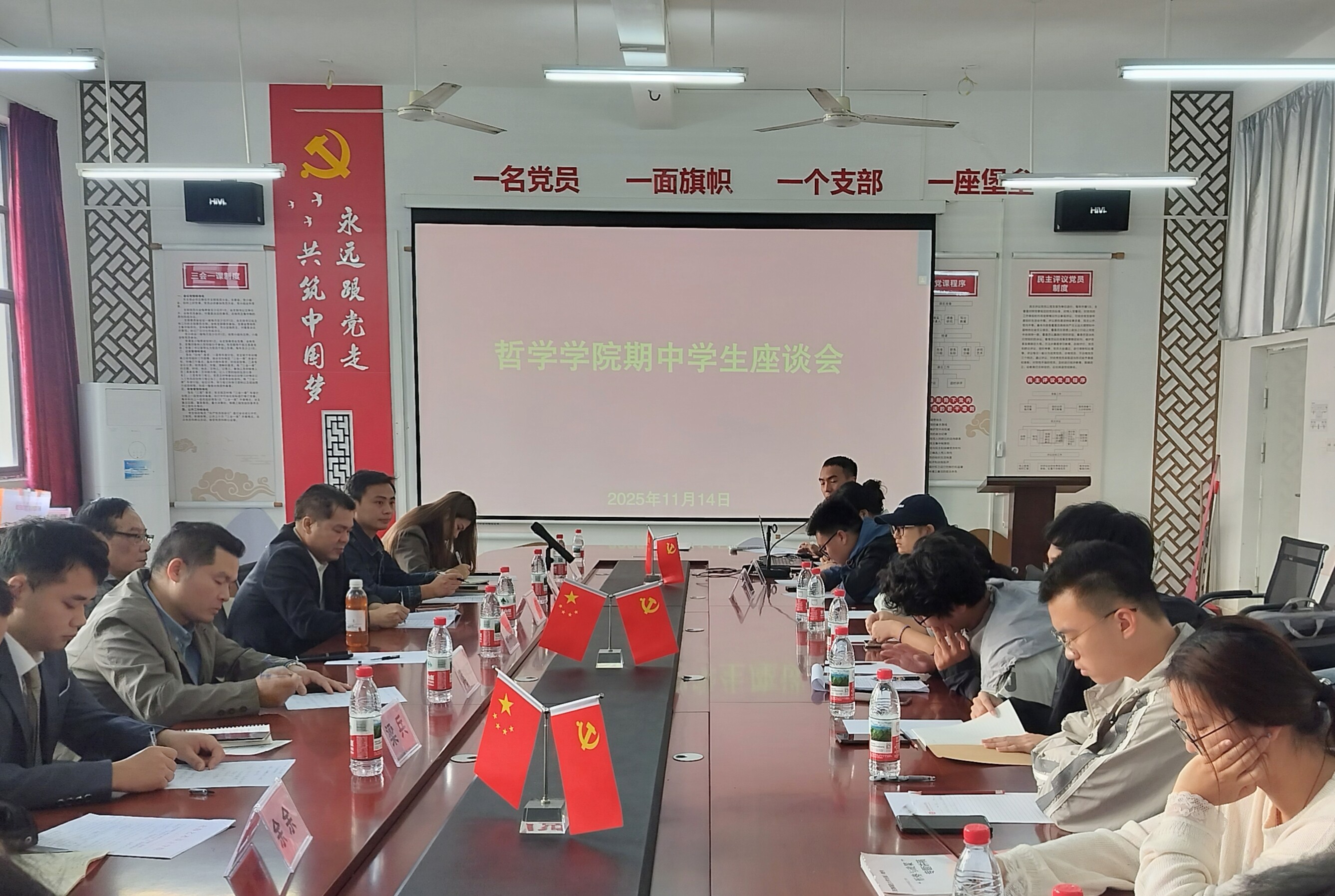 为全面了解学生学习动态,及时回应学生诉求,11月14日上午,哲学学院在公德楼204会议室召开2025-2026学年第一学期期中学生座谈会,学院院长蒙绍荣、党支部书记谢伟、常务副院长李水亮、副院长蒋辉平、覃传茵、梁兵、各部门负责人、全体班主任及全院20位学生代表参会。